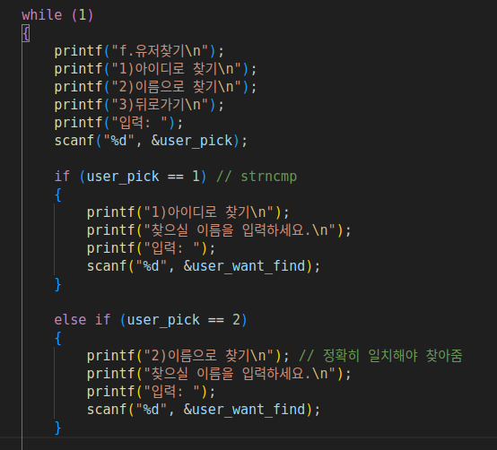 아이디는 일부만 맞으면되니 strncmp를 쓰면 될거같다. ( 회원정보 리스트, 유저가 입력한 글자, 유저가 입력한 글자의 길이 )