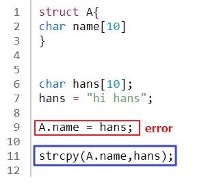 구조체 안에 있는 배열에 값을 할당할 때 직접대입하면 안되고 strcpy로 넣어주어야 한다