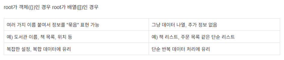 보통 루트가 배열이면 여러 객체를 담고, 루트가 객체이면 그 안에 또 배열이 들어갈 수도 있다.