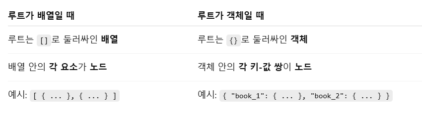 루트는 JSON 데이터 전체를 대표하는 하나의 큰 객체 or 배열 이다.