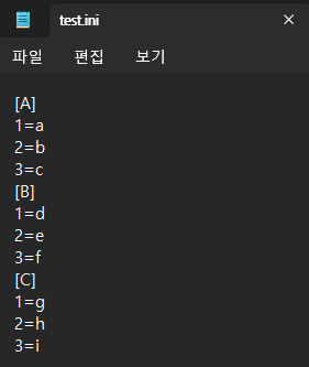 GetPrivateProfileString("A", "1", "a", A1, 32, "\test.ini"); // 섹션, 키, 기본값, 변수, 크기, 경로