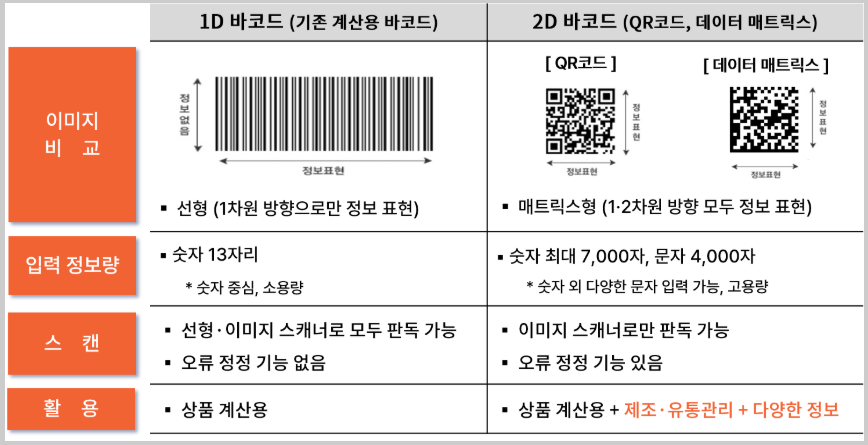 1. 1D 바코드 우리가 흔히 마트에 가면 상품에 붙어있는 바코드이다. 정보가 1차원 방향으로만 표현되어있다. 2. 2D 바코드 정보가 2차원 방향으로 표현되어있다. [ 참고 사이트 ] https://retailtalk.co.kr/Trend/?bmode=view&idx=16947915 공유하기 게시글 관리 주코딩일지
