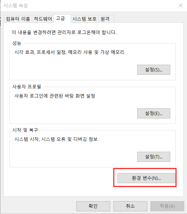 6. 윈도우에 '시스템 환경 변수 편집' 을 검색해서 열어준다.